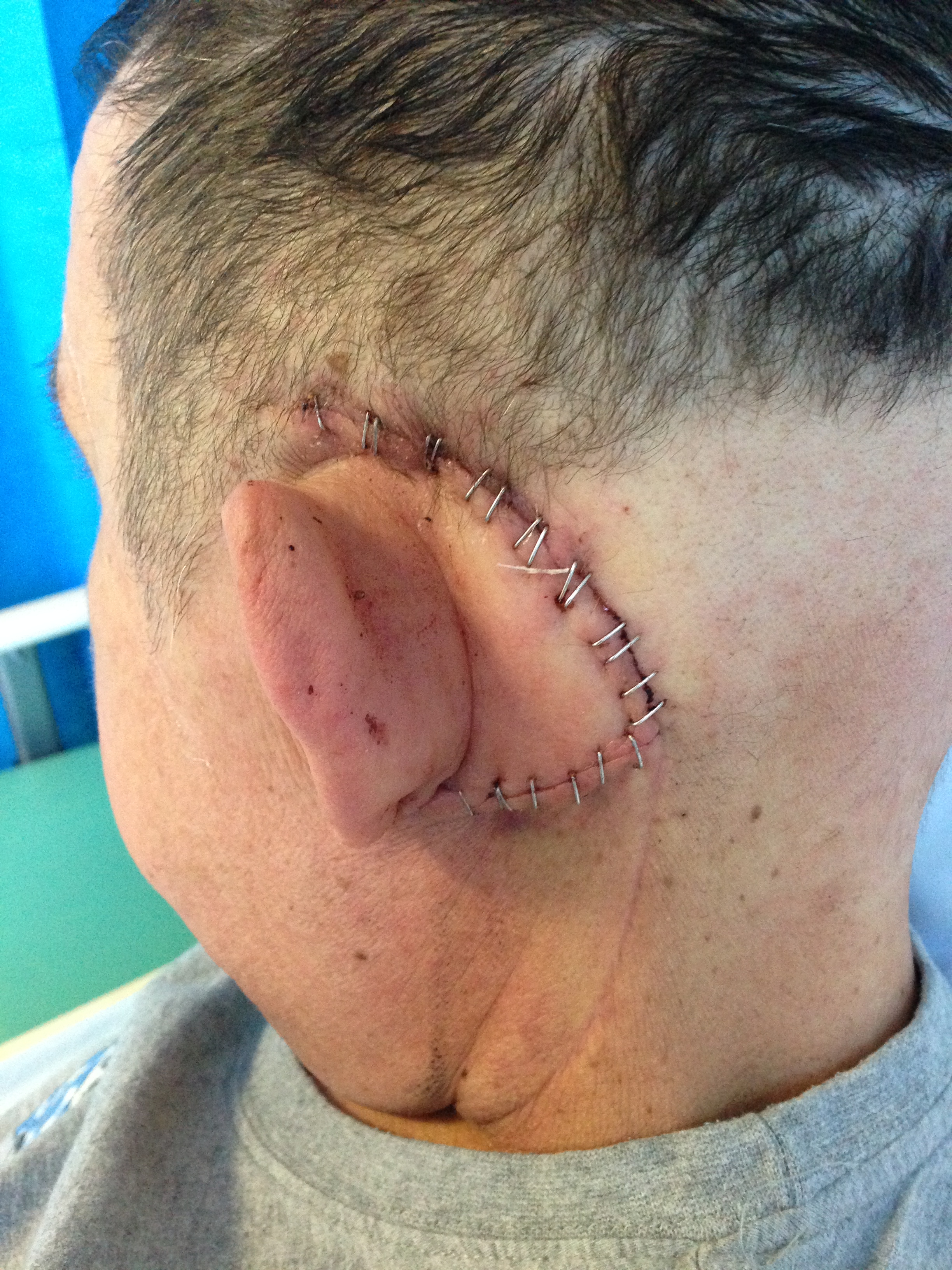 This operation has come as a bit of a set back, but was needed to trying to repair and reconnect my inner ear with my outer ear to restore the hearing in this ear, this was partly due to November operation and further damaged by the radiotherapy. If I didn’t have this operation my ear would have been prone to regular infections. Unfortunately the issue couldn’t be fixed and they had to close off the ear channel, which now means I have lost the normal hearing in this ear, but over the next couple of months I should be able to get a Baha bone connected hearing aid which will then hopefully give me back pretty good hearing in this ear. I’m now slowly getting over the operation and my ear is still sore and tender and blood is still coming out a bit from my ear, but hopefully this will all improve over the next couple of days. The staples will be taken out next Friday and hopefully the ear will be healing well by then.